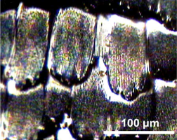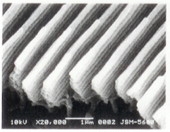 Observe in figure 4 the cross-section of a lamellar structure. These structures are patterned across the surface of the wing and down to the cuticle. These structures are simple in geometry but their position and orientation limit replicating techniques.