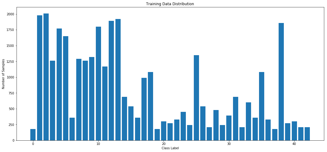 Here is an exploratory visualization of the data set. The bar chart shows the distribution of training samples by class label.