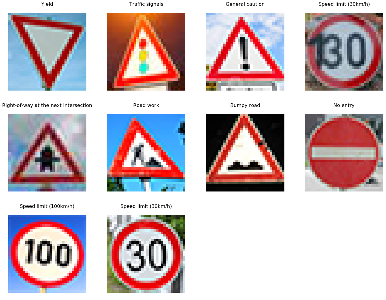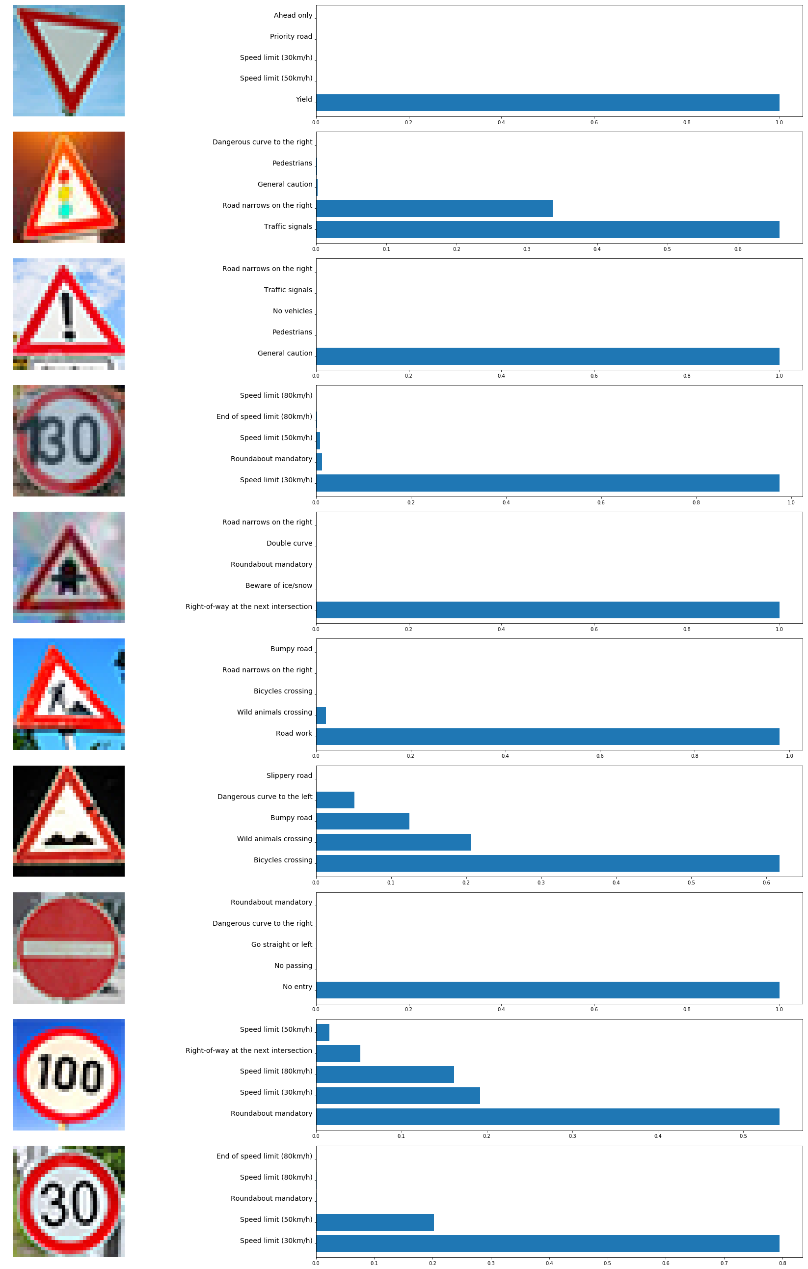 The model was able to correctly guess 8 of the 10 traffic signs, which gives an accuracy of 80%. I was impressed that the spray-painted sign still classified correctly even though the clear 100km/h sign was wrong.