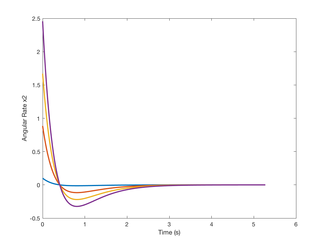 The MATLAB follows the same steps outlined here by calculating the Jacobian, evaluating at the nominal trajectory and forming the closed loop dynamics. We can use MATLAB’s command to obtains the value of that places the poles of at desired locations. With closed-loop dynamics defined, MATLAB’s function provides a state-space model that can be used to observe system responses.