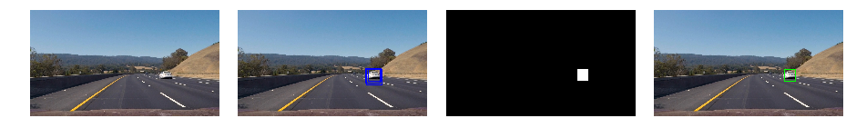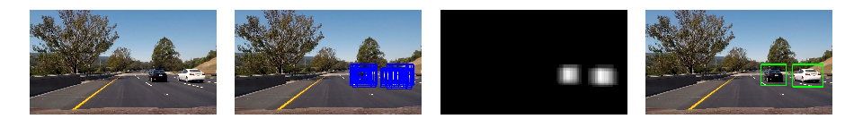 I recorded the positions of positive detections in each frame of the video. I also track and add the previously detected positions. From the positive detections, I created a heat map and then thresholded that map to identify vehicle positions. I then used scipy.ndimage.measurements.label() to identify individual blobs in the heat map. I constructed bounding boxes to cover the area of each blob detected.