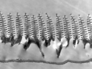 Observe in figure 4 the cross-section of a lamellar structure. These structures are patterned across the surface of the wing and down to the cuticle. These structures are simple in geometry but their position and orientation limit replicating techniques.