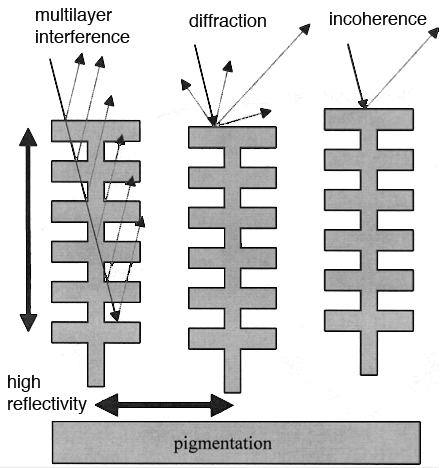 Structural colors have special properties such as intensity patterns under different orientations, and brilliant sparkling or glistening on the surface. This phenomenon has been studied extensively and the papers referenced here support a multi-layered model seen in figure 4. The tree-like structures reflect the light and cause constructive and destructive interference at the micro level in the material [8].