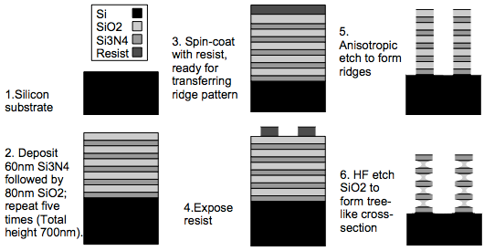 The method is outlined in figure 5 and uses alternating layers of and deposited on a substrate. This allows for anisotropic and isotropic etching used to replicate the 3D structures seen in figure 2. This method is relatively simple and makes use of multilayer deposition which is more feasible than other methods such as focused ion beam Chemical Vapor Deposition (CVD) [6].