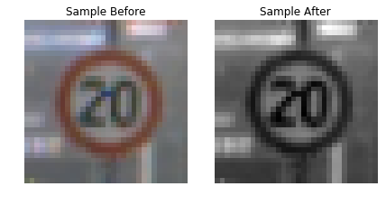 Here is an example of a traffic sign image before and after grayscaling and normalization.