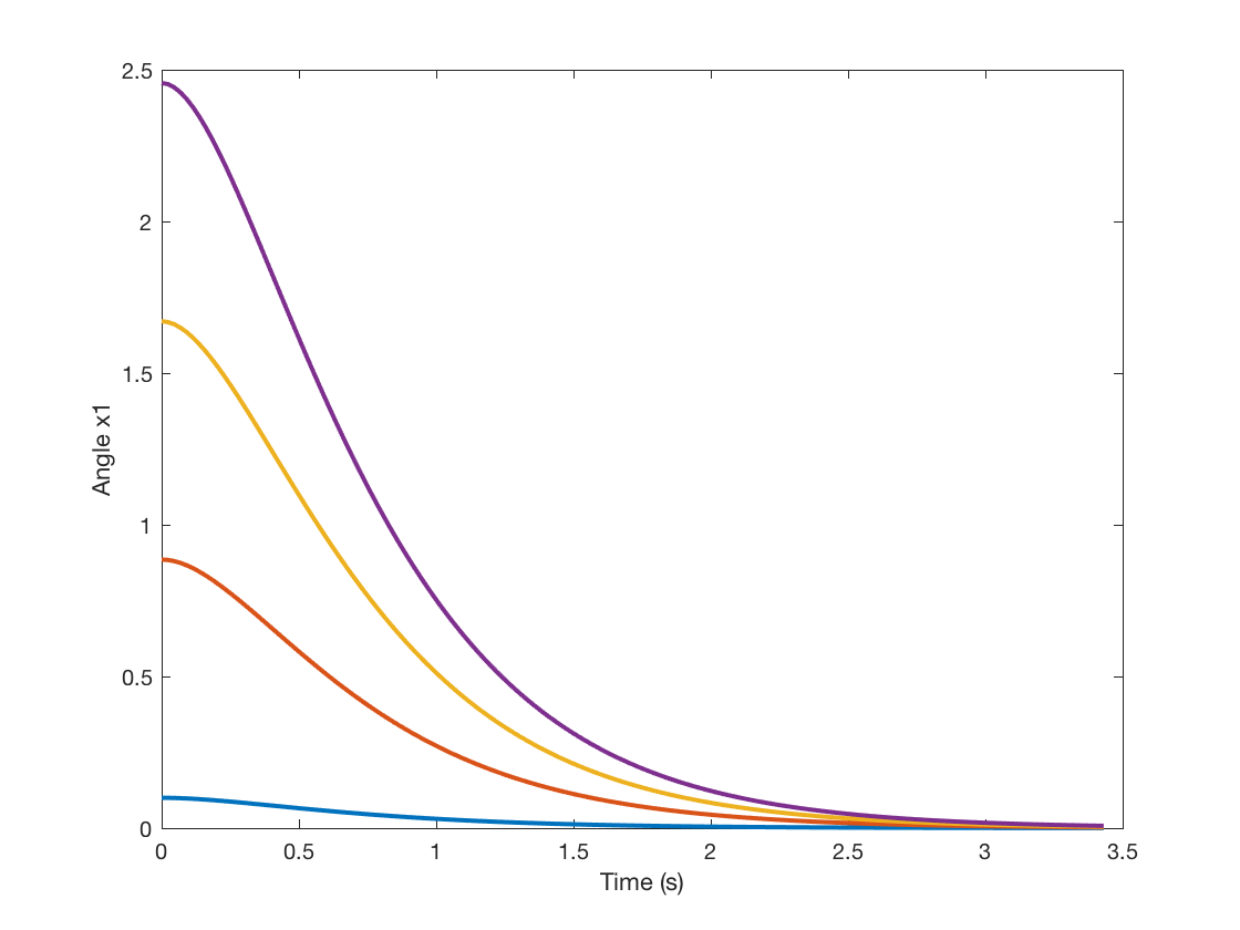 Simulations shows the response under increasing initial conditions on the angle and angular rate.