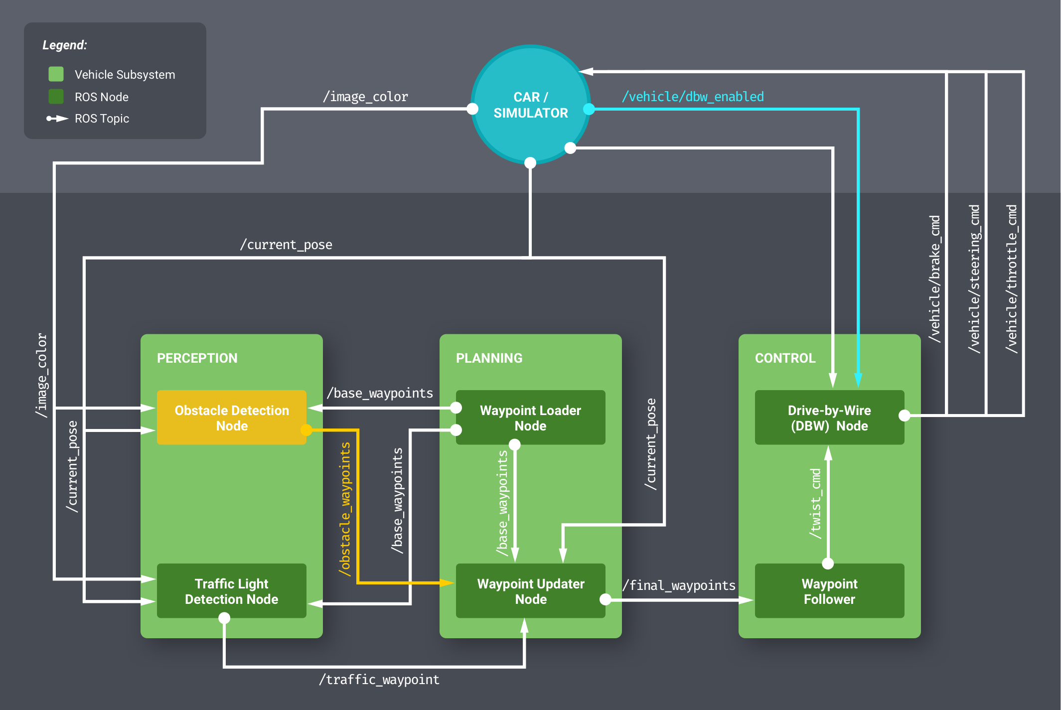 /current posecurrent position of the car/base_waypointsplanned route/vehicle/traffic_lightspositions of all traffic lights/image_colorcolor of the current light in front of the car