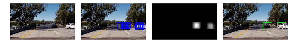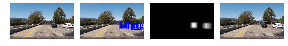 I recorded the positions of positive detections in each frame of the video. I also track and add the previously detected positions. From the positive detections, I created a heat map and then thresholded that map to identify vehicle positions. I then used scipy.ndimage.measurements.label() to identify individual blobs in the heat map. I constructed bounding boxes to cover the area of each blob detected.